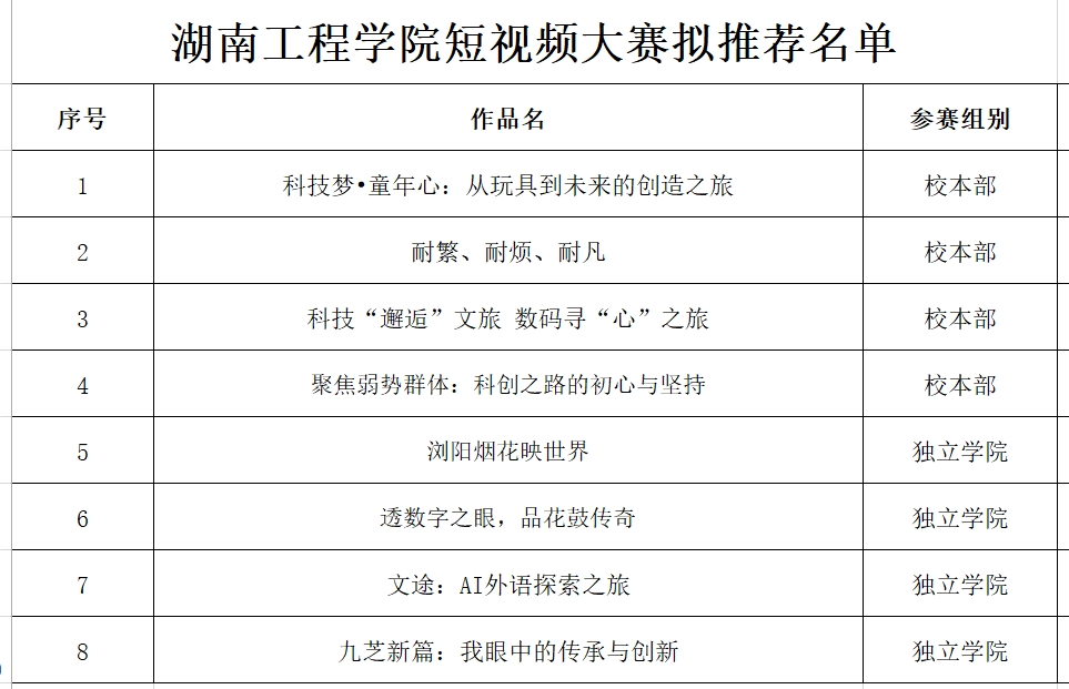 根据《关于举办第二届湖南省大学生“用英语讲好湖南故事”短视频大赛的通知》和《关于举办第二届湖南工程学院“用英语讲好湖南故事”短视频大赛暨省赛选拔赛的通知》精神,经学生团队申报,校内外专家评审推荐,拟定“科技梦•童年心:从玩具到未来的创造之旅”等4个作品获一等奖,“浏阳烟花映世界”等7个作品获二等奖。根据省级复赛推荐指标要求及团队申报意愿,拟推荐“科技梦•童年心:从玩具到未来的创造之旅”等4个作品代表校本部,“浏阳烟花映世界”等4个作品代表应用技术学院参加第二届湖南省大学生“用英语讲好湖南故事”短视频大赛。现将结果予以公示。