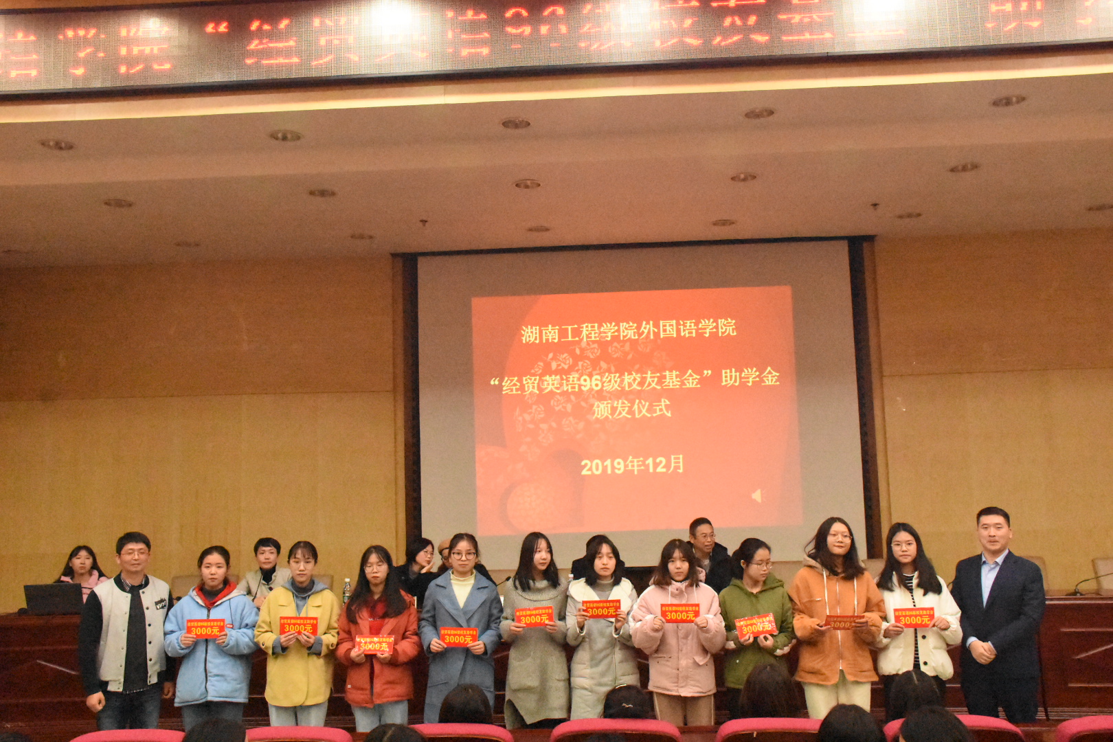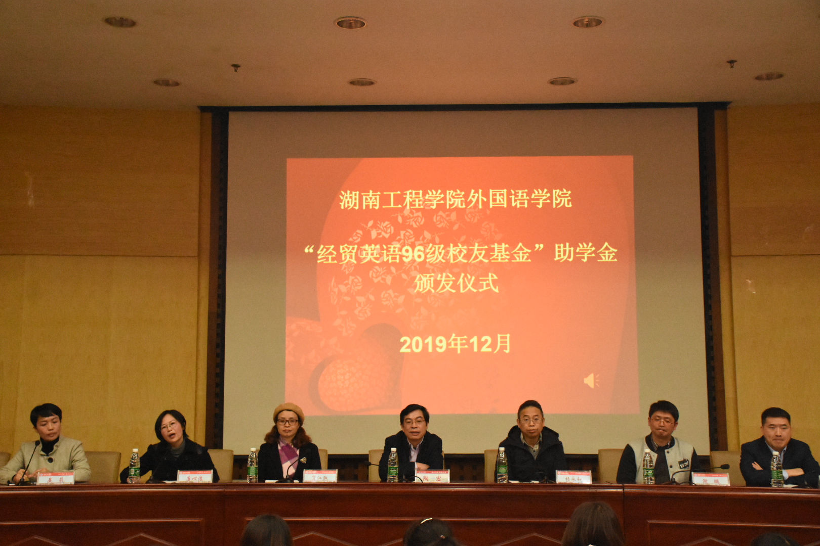 12月5日19:00,beats365唯一官方网站于二报告厅举办了经贸英语96级校友助学金颁发仪式。校友办主任陶宏,beats365唯一官方网站院长杨永和、党总支书记肖江淑、经贸英语96级班主任唐心洁、96级校友代表张科林、谢鹏和学院学生代表参加了本次仪式,仪式由学院学生工办公室主任晏莉主持。