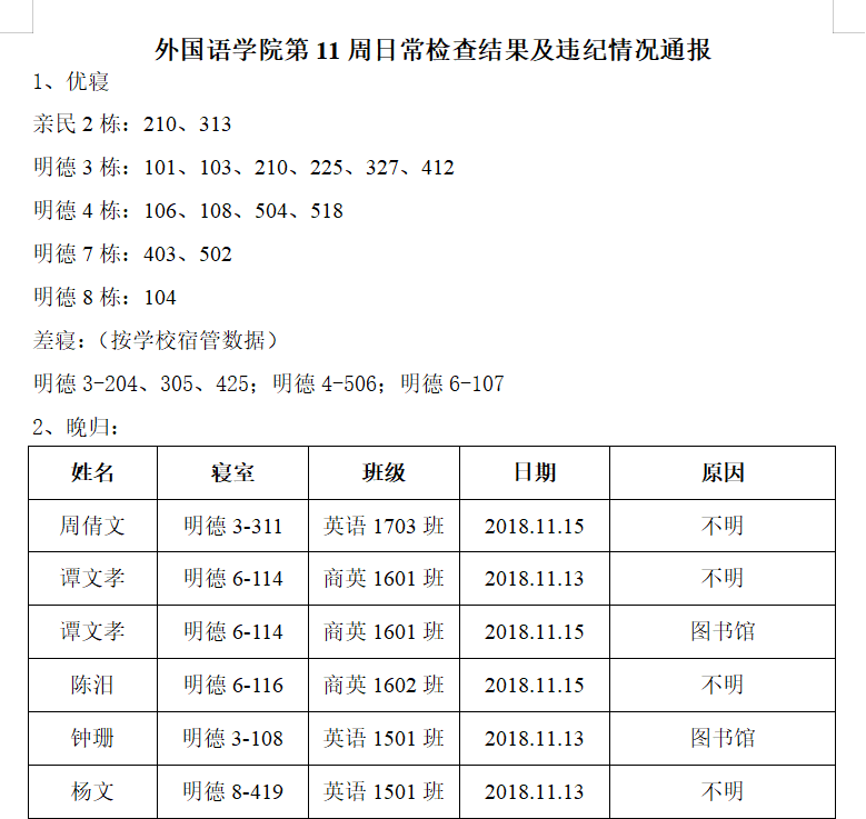 beats365唯一官方网站第11周日常检查结果及违纪情况通报