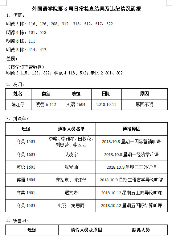 beats365唯一官方网站第6周日常检查结果及违纪情况通报