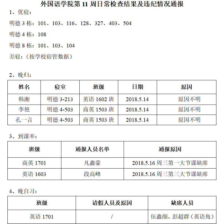 beats365唯一官方网站第11周日常检查结果及违纪情况通报