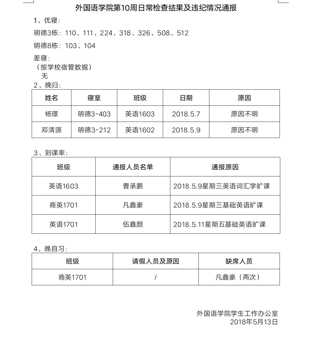beats365唯一官方网站第10周日常检查结果及违纪情况通报