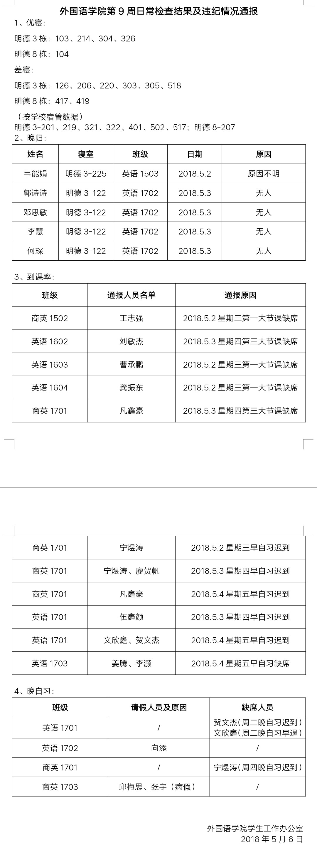beats365唯一官方网站第9周日常检查结果及违纪情况通报