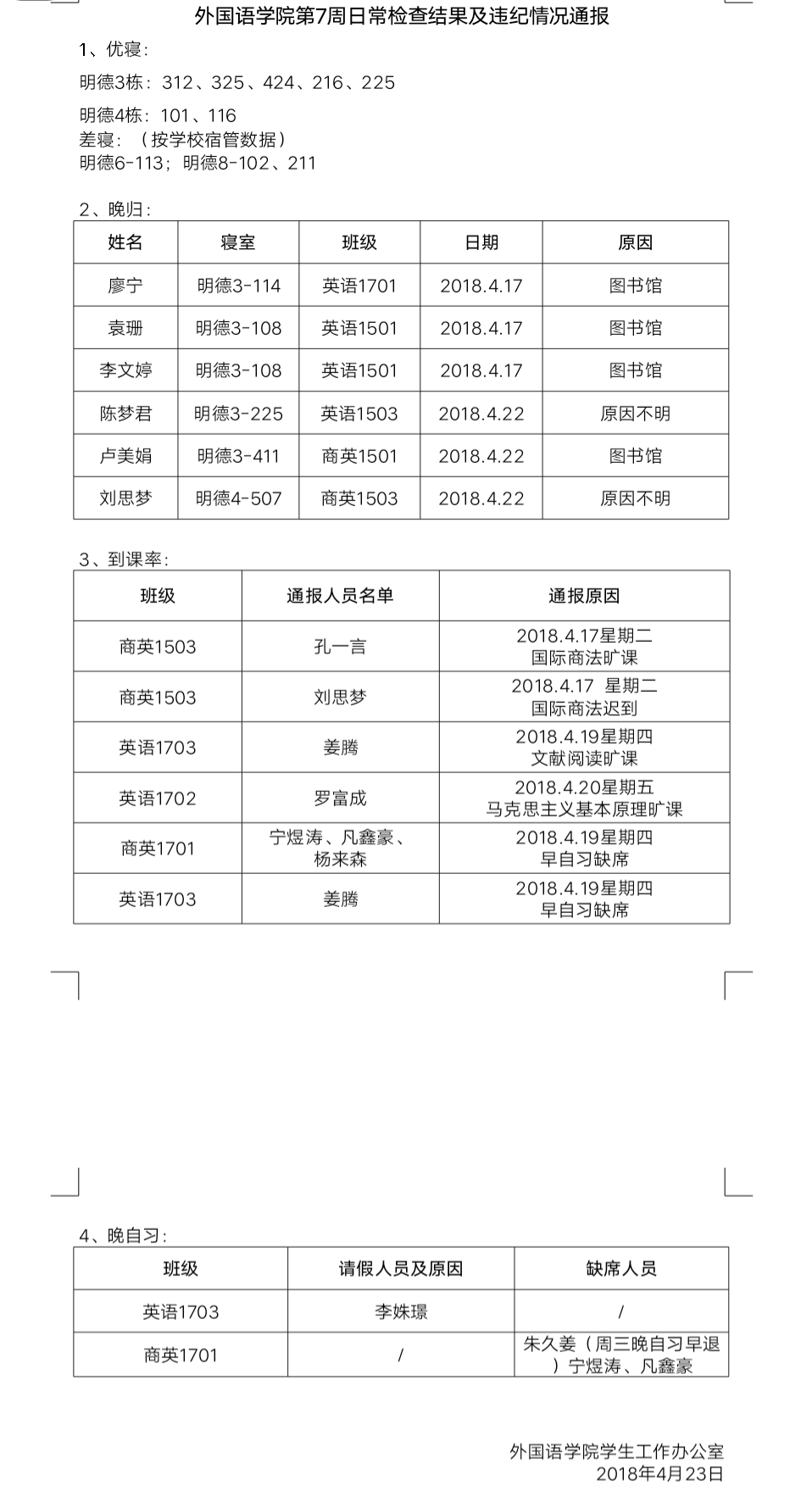 beats365唯一官方网站第7周日常检查结果及违纪情况通报