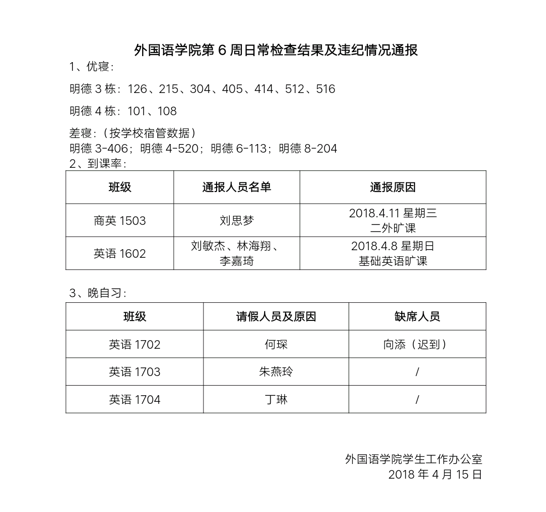 beats365唯一官方网站第6周日常检查结果及违纪情况通报