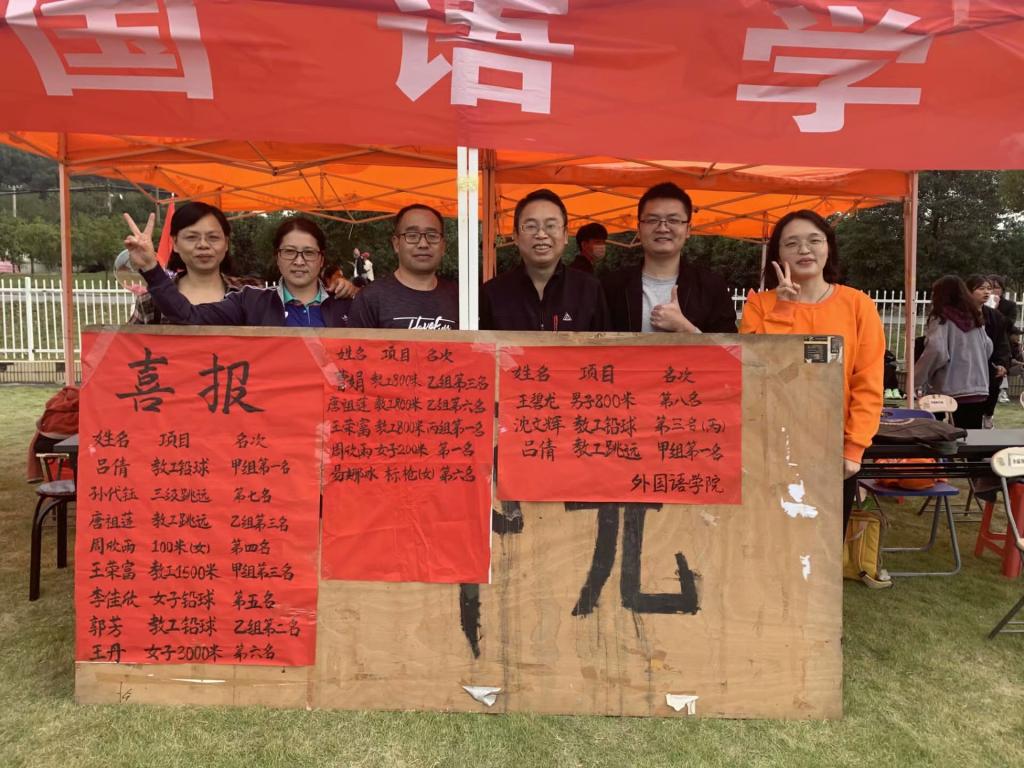 在历时两天的比赛中,外院喜报连连,战果累累。教职工组吕倩老师获女子铅球、跳远甲组双料第一名,王荣富老师获800米跑丙组第一名、1500米跑甲组第三名,唐祖莲老师获女子跳远乙组第三名、800米跑乙组第六名,郭芳老师获女子铅球乙组第二名,曹娟老师获女子800米跑乙组第三名,沈文辉老师获男子铅球丙组第三名,学生组周欣雨同学获女子200米跑第一名、100米跑第四名,孙代钰同学获三级跳远第七名,李佳欣同学获女子铅球第五名,王丹同学获女子3000米跑第六名,王碧龙获男子800米跑第八名以及团体20x60女子接力赛第七名。