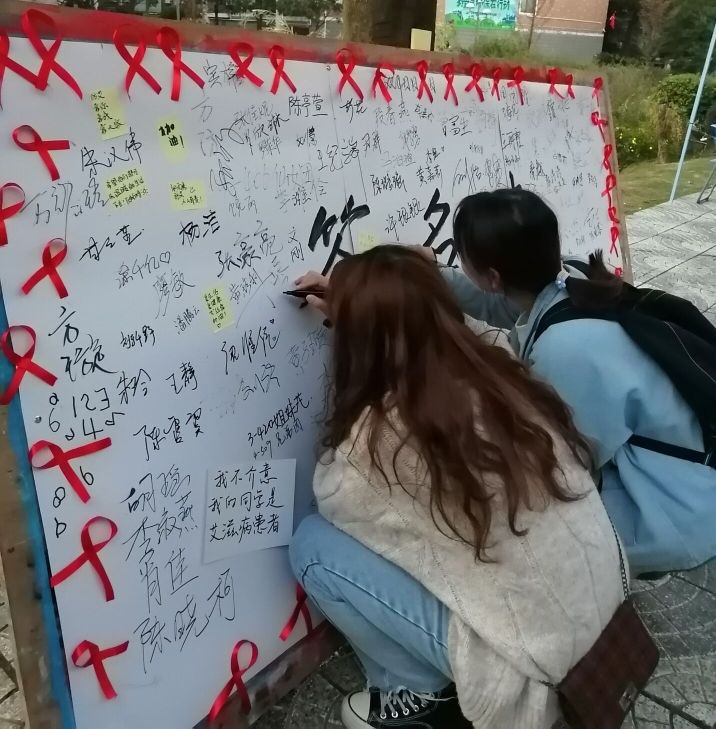 活动伊始,工作人员身着玩偶服装,举牌“我是艾滋病患者,可以给我一个拥抱吗?”与周边路人拥抱,并拍照留念,为本次设点宣传拉开了帷幕。随后,工作人员招聘路过同学在签名墙进行签名留言,分享作为当代大学生对艾滋病的态度和看法。紧接着,摆点人员组织开展防艾知识答题竞赛和防艾知识有奖问答活动,借此提高同学们对预防艾滋病的关注度,同学们积极参与,灵活应答,并获得了小礼品。活动最后,工作人员就同学们对艾滋病的了解程度进行了采访,并以现场广播的方式向同学们宣讲防艾知识,动员全校师生主动、积极加入到防治艾滋病的工作中,携手共创健康校园。