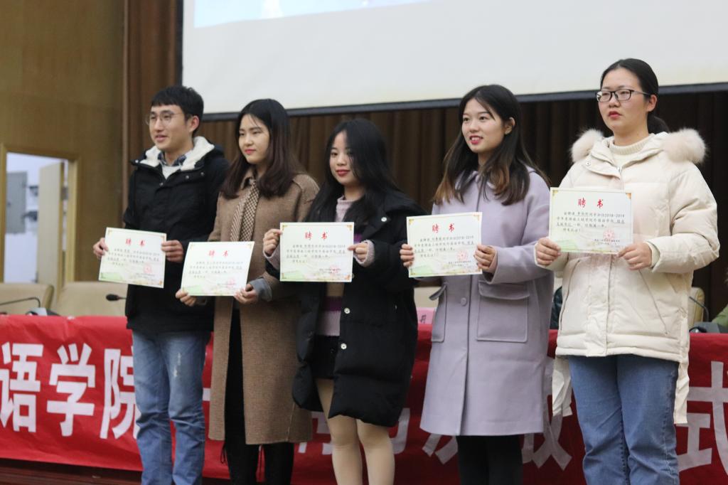 在干部聘书发放仪式上,肖书记对团学会干部顾大局、抓细节、肯吃苦、勤自省的工作态度表示肯定。她希望团学会的每一个成员都明确自己肩负的责任,不断增强外院团学会的凝聚力和感召力,充分发挥桥梁和纽带的作用,把广大同学紧密联系在一起。随后上届团学会主席刘菁薇发表讲话。她表示,三年的团学会生活让她收获了真心的友谊、沉稳的心态、不忘初心的使命感和切实的行动意识。她指出,要把团学会建设成领导放心、同学满意的队伍,需要团学会全体成员秉持奉献之心,多些热情稳重,少点消极懈怠,热情细心地服务同学,沉稳踏实地对待工作。接下来,2018届优秀干部代表姚晓玥上台发言。她从实际出发,强调团学会干部要摆正位置,严谨负责地对待工作,明确“为同学服务”的宗旨,在突破困难中获得成长、实现价值。在之后的校运会表彰大会上,阮才涛代表运动员上台发言,感谢了学院领导、老师的关心支持与学生会工作人员的幕后支持,他分享了参加校运会的心路历程,表示要把在校运会上体现出的勇往直前,积极进取的精神带到今后的学习生活中。最后,老师们为获奖运动员和运动会积极分子颁奖并合影留念。