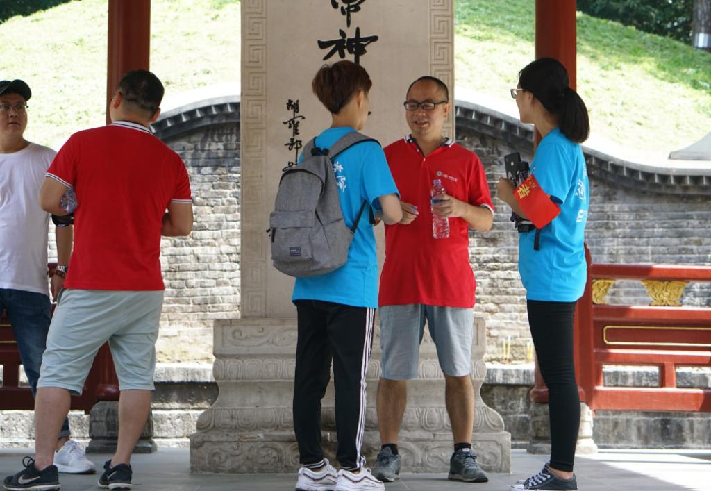另一队志愿者则正在向讲解员询问景区各个板块的设计意图和文化内涵,为接待游客的做知识储备,他们的身影穿梭于炎帝陵景区中,引导游客队伍选择合适的参观路线、为游客讲述神农炎尝遍百草救人治病的传说、一些碑文、雕塑进行讲解说明。