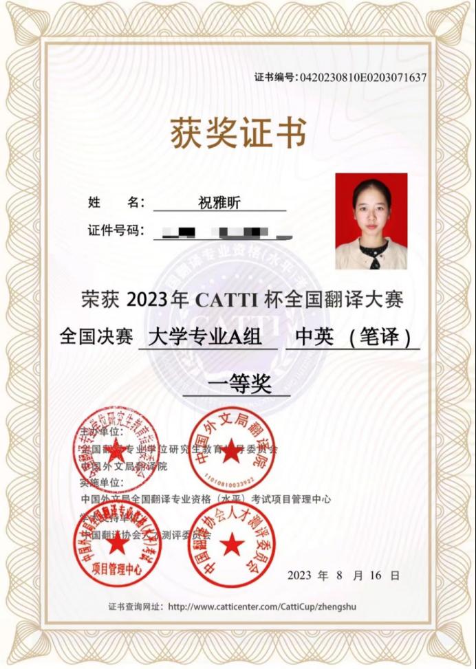 近日,2023年“CATTI”杯全国翻译大赛已顺利落幕,beats365唯一官方网站英语专业祝雅昕同学喜获决赛一等奖,beats365唯一官方网站获优秀组织奖。