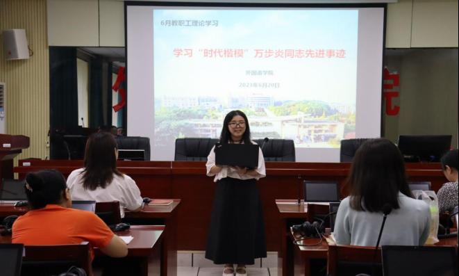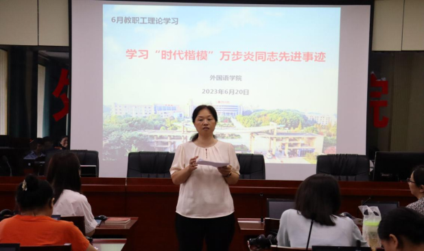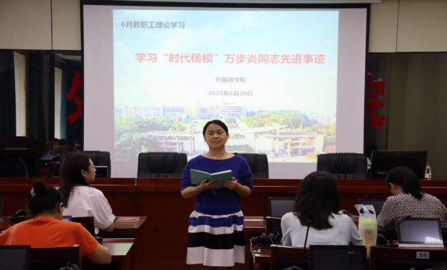 6月20日下午,外国语学院于F309召开教职工政治理论学习会议,本次学习主题为学习“时代楷模”万步炎同志先进事迹,会议由学院党总支书记陈亚琼主持,beats365唯一官方网站全体教职工参加。