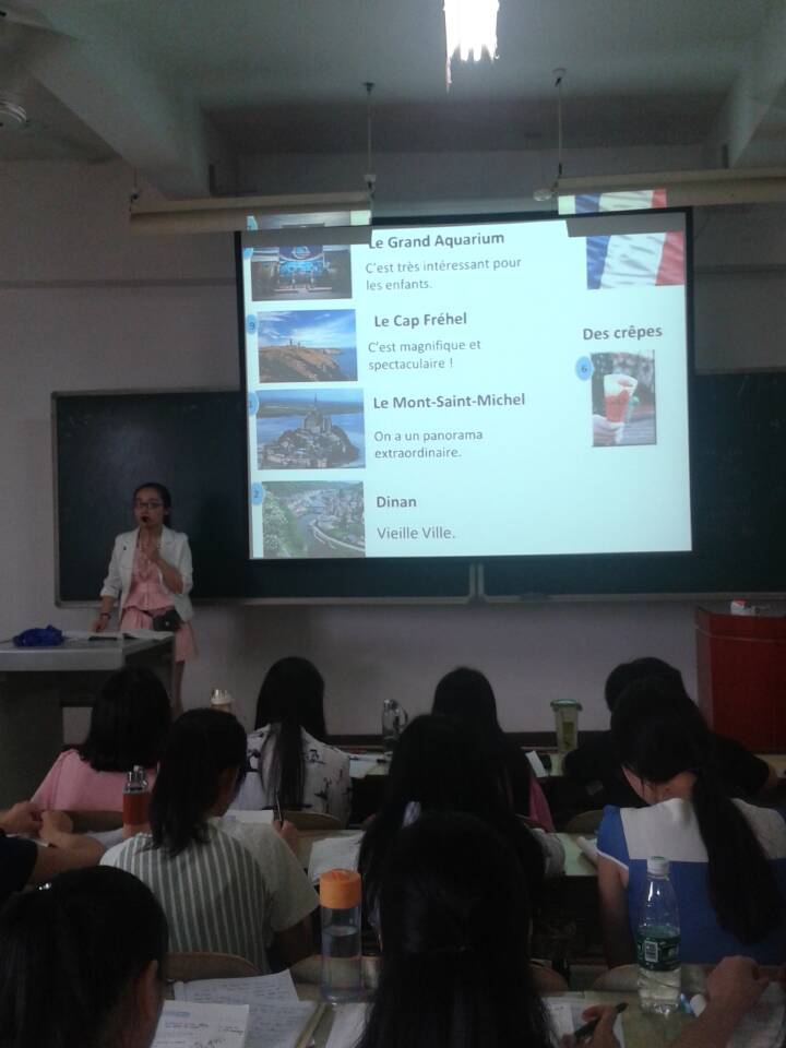张赟老师讲授的是《新公共法语》第10课À l’office de tourisme。首先,她以分组抢答的形式引导学生复习了上节课所学重点单词和句型,通过介绍布列塔尼地区的有名景点及美食等文化知识充分激发学生的学习兴趣,然后再次使用分组抢答的方式引导学生快速阅读课文;接下来她详细讲解了课文中的重点与难点。整个教学过程中,师生互动积极,课堂气氛活跃,学生兴趣浓厚,学习效果良好。课后,听课老师对此次公开课进行了热烈的讨论,大家一致认为张赟老师娴熟运用现代教育技术的风采、有效激发学生学习兴趣的教学方法、收放自如的课堂驾驭能力等,充分体现了她对教学过程的精心设计,完美展示了年轻老师热情奔放然沉稳扎实的教学作风,值得大家学习。