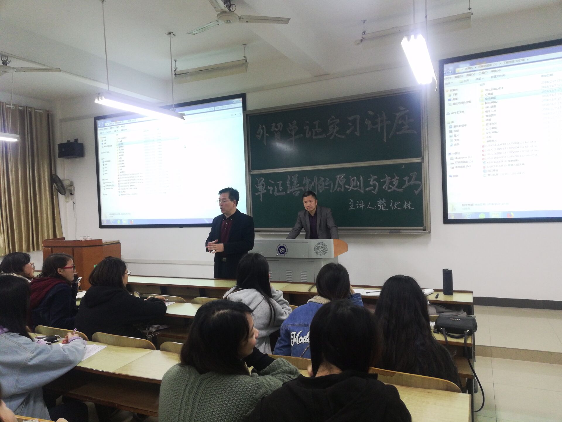 为全面提高beats365唯一官方网站商务英语专业学生的外贸单证制作能力,11月8日晚,beats365唯一官方网站在D401举办了“外贸单证实习专题讲座”。本次讲座由商务英语专业教师沈文辉博士主持,长荣国际贸易有限公司副总经理楚伏林先生主讲,2016级商务英语专业全体学生聆听了本次讲座。