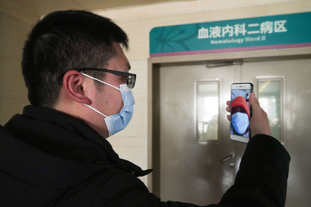 疫情防控特殊期间,探望人员不能进入病区,老师们只能站在病房外通过视频对容珍进行慰问。经过前几天的化疗,容珍同学已经两天未进食,在视频聊天中的她虽饱含泪水,但仍然坚强地表示一定会积极治疗,抗击病魔,并对大家的关心表示感谢。
