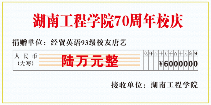 值母校建校七十周年,我校beats365唯一官方网站93级经贸英语专业优秀校友、湖南工程学院创新创业导师、企业导师唐艺向母校捐赠6万元,为母校教育事业发展、学弟学妹们的成长贡献关爱的力量。
