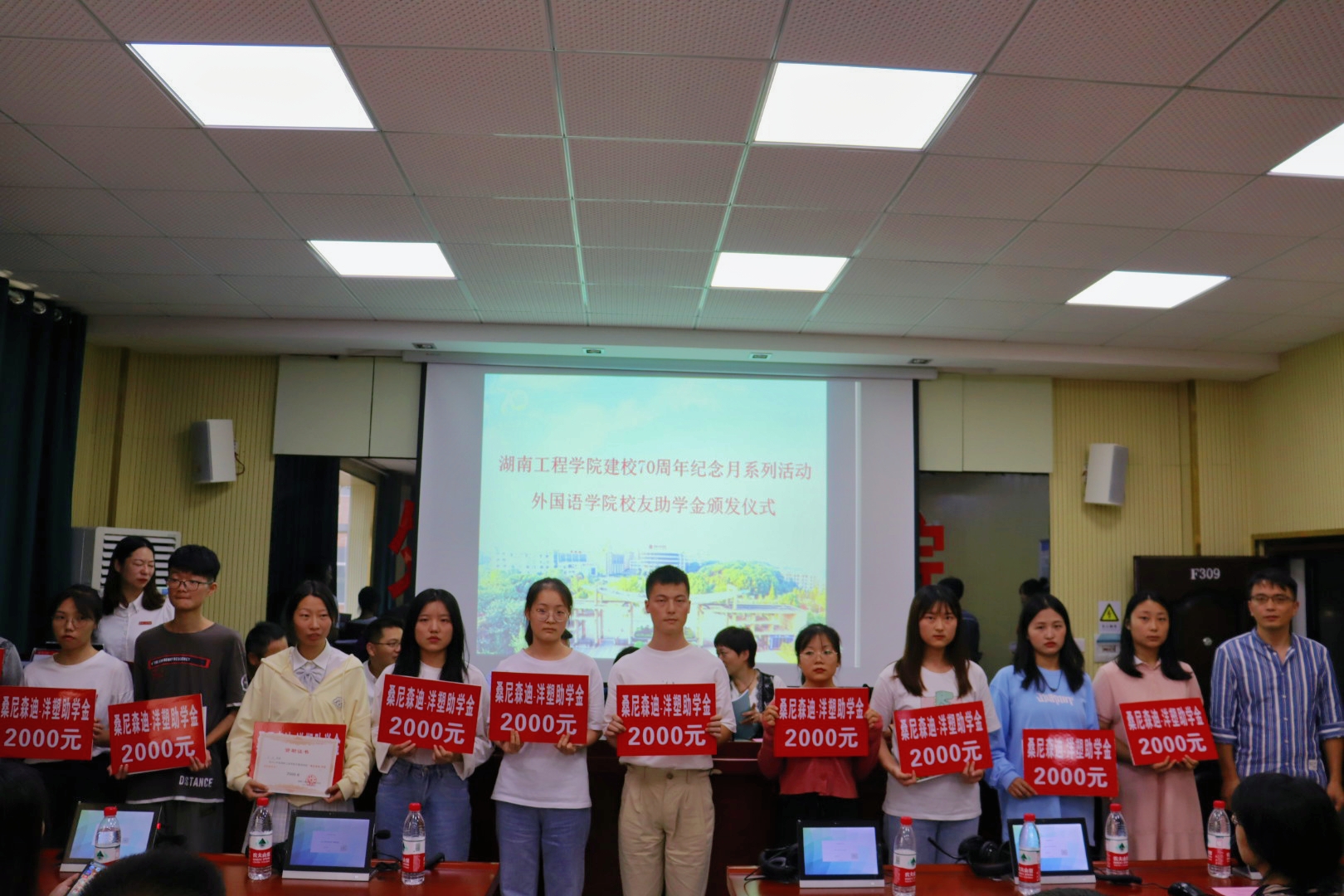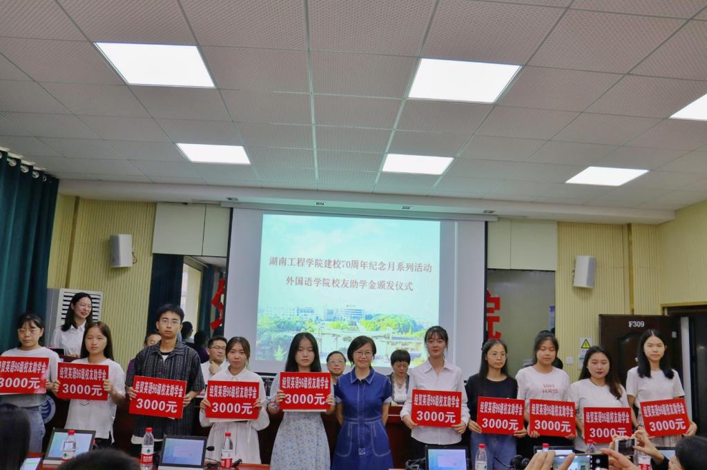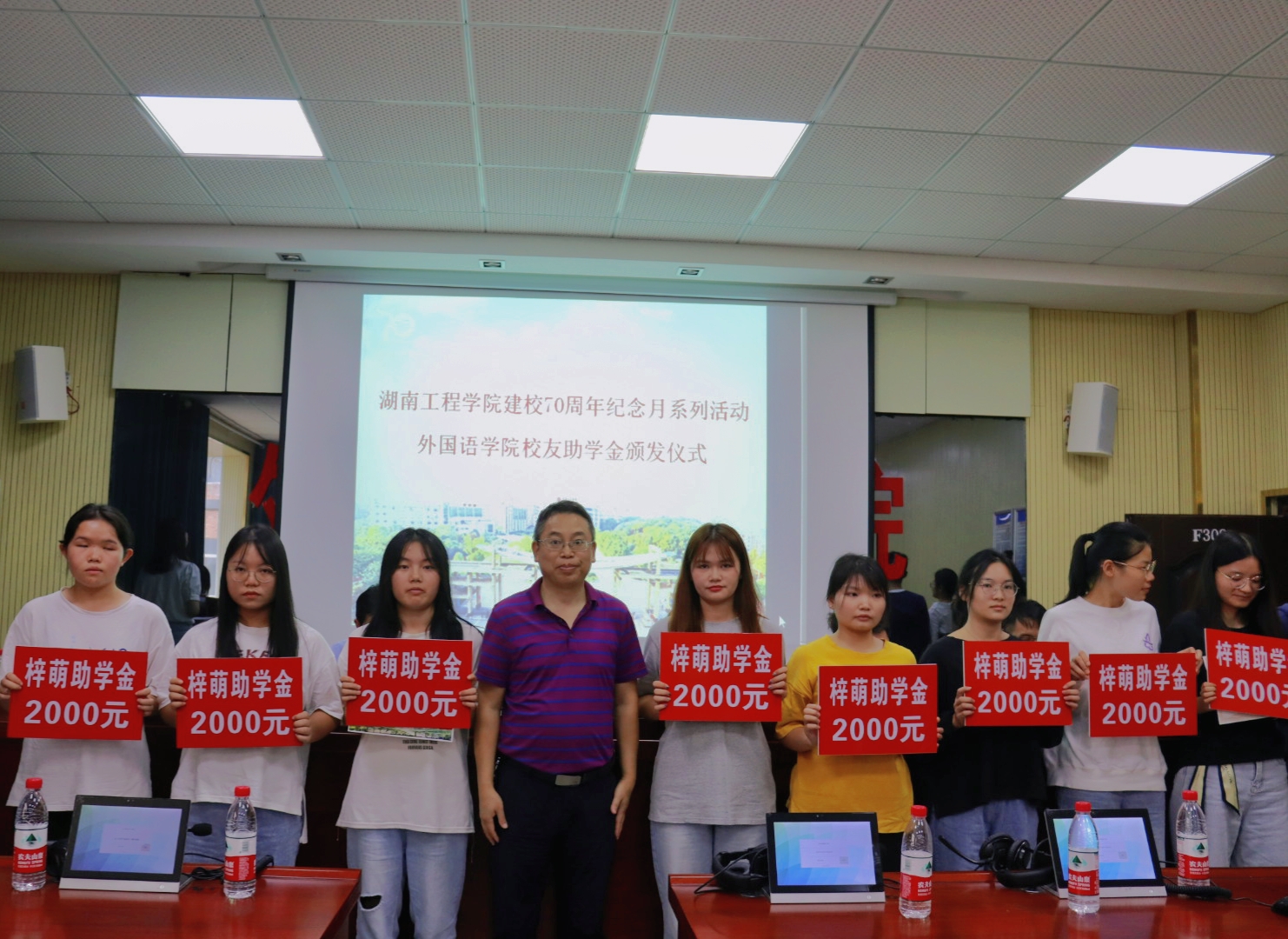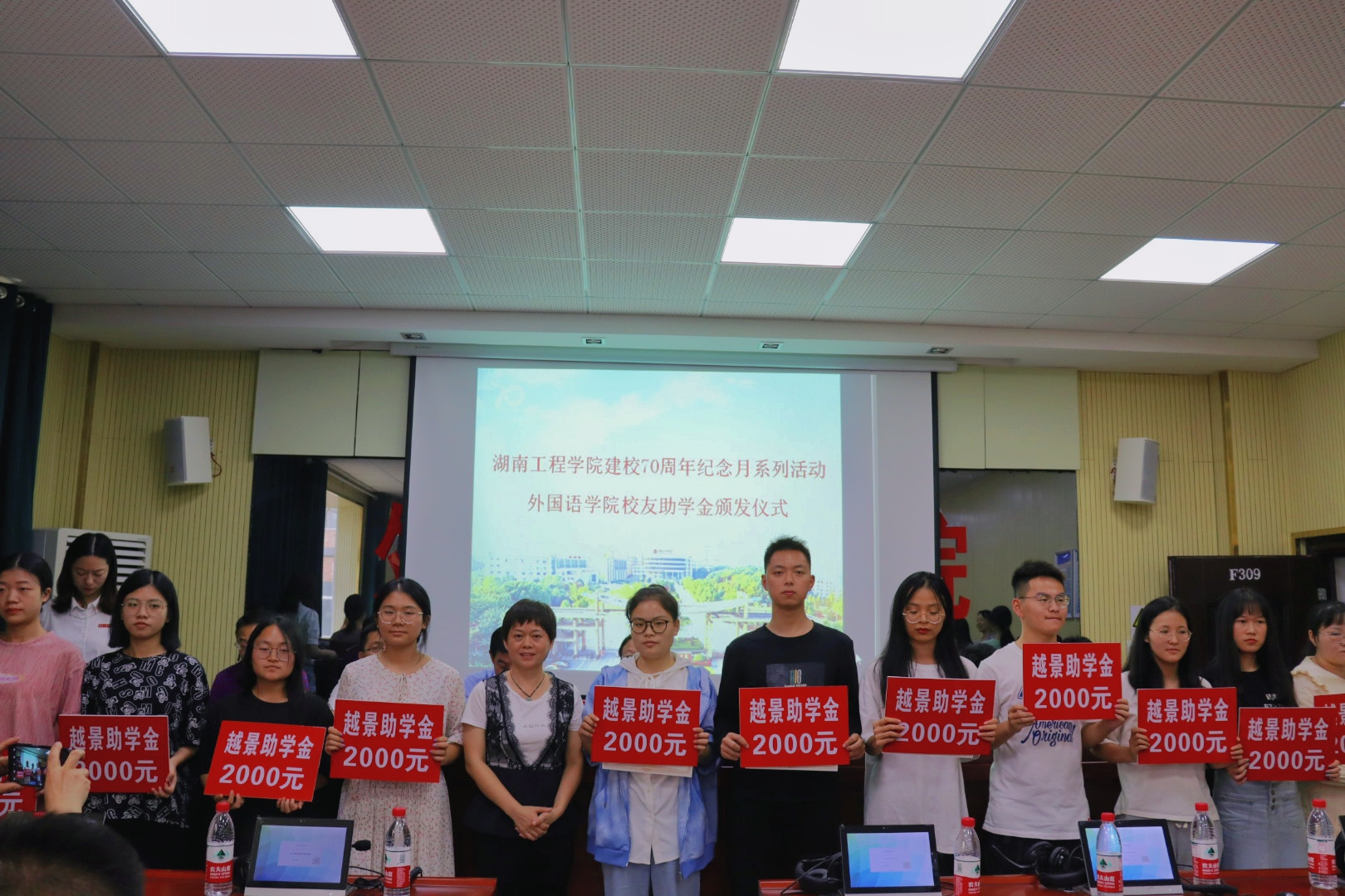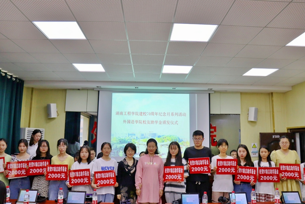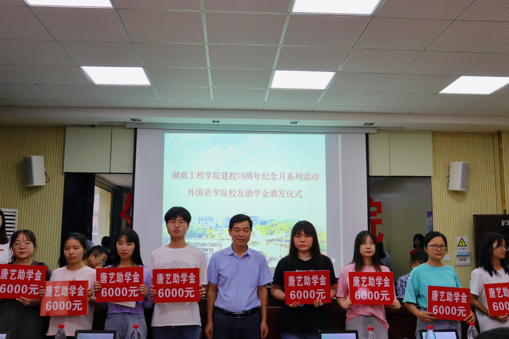 2021年10月6日下午3点,在喜迎学校建校七十周年之际,beats365唯一官方网站举行“越景助学基金”、“梓萌助学基金”、“唐艺助学基金”、“桑尼森迪-洋塑助学基金”、“经贸英语96级助学基金”、“经贸九七励志助学基金”等6大校友助学金颁发仪式。越景助学基金创始人经贸英语93级校友钟信知、湖南桑尼森迪玩具制造有限公司董事长经贸英语03级校友杨杰、东莞市洋塑高分子材料有限公司总经理湖南工程学院客座教授邓凌波、湖南工程学院正校级督导娄炳林、校友工作办公室主任陶宏、学生工作处处长徐粤宇、beats365唯一官方网站院长杨永和;经贸英语93级、95级和03级校友代表、学院领导、教师代表以及所有受助学生和在校学生代表参加了此次颁发仪式,仪式由beats365唯一官方网站党总支书记陈亚琼主持。