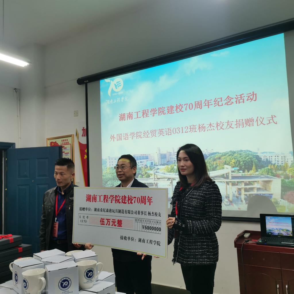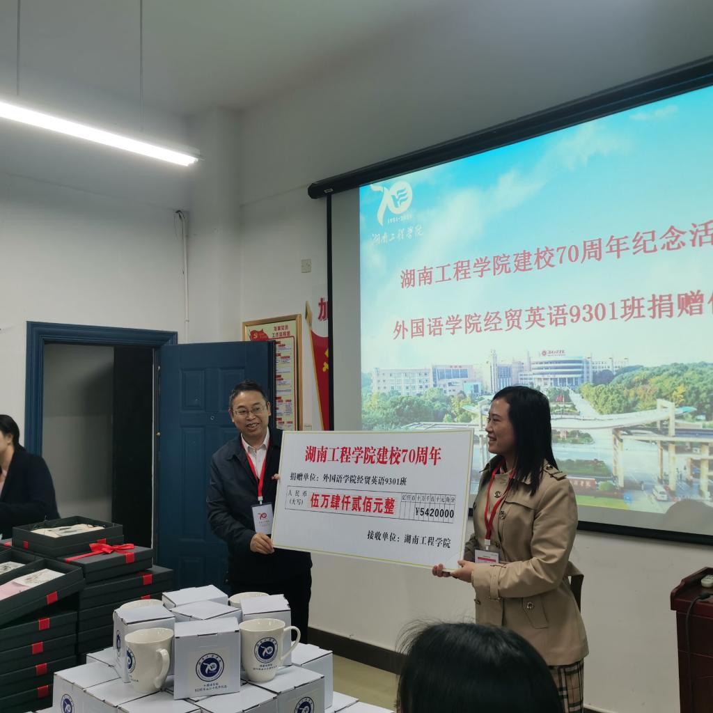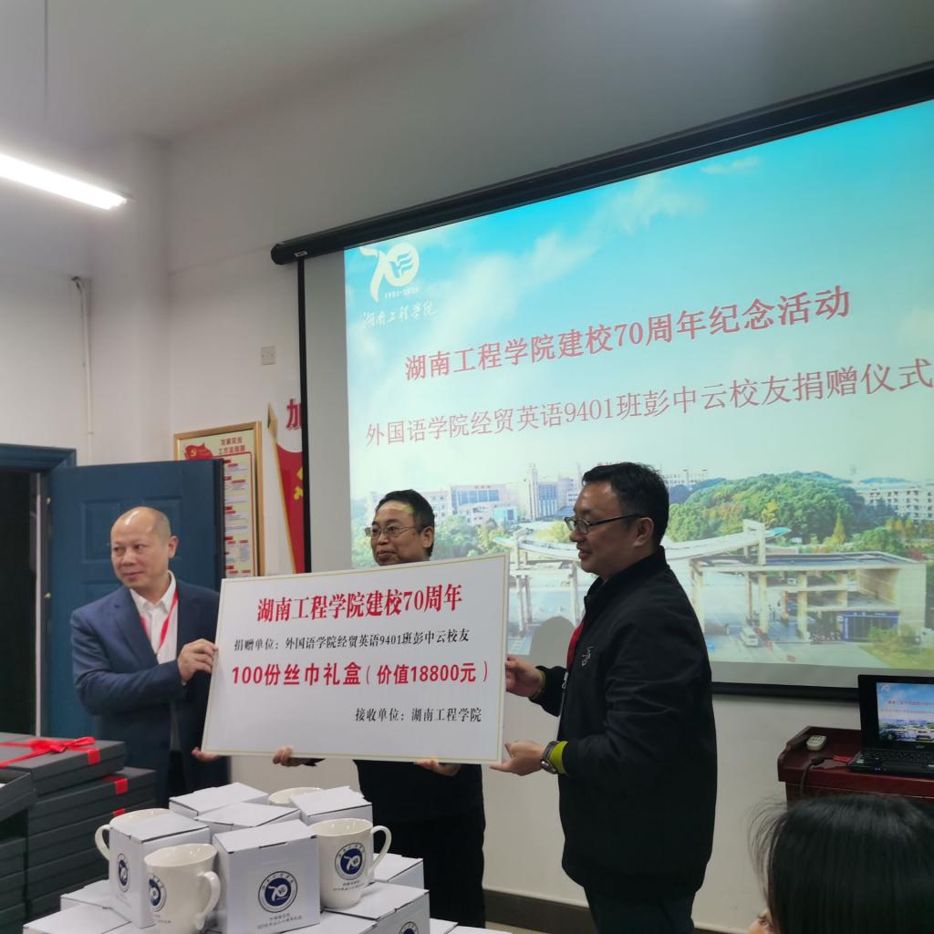 仪式上,经贸英语9301班文丰代表班级捐赠54200元;经贸英语0312班许展和刘倩雯代表杨杰校友捐赠50000元;经贸英语9401班洪庆华和杨东代表彭中云校友捐赠价值18800元的丝巾礼盒100份;杨永和院长代表经贸英语9802班覃瑜校友送上200份校庆纪念杯。陈亚琼代表学院再次表示感谢:校友们的捐赠,都是心的表露,情的凝聚,饱含的都是湖工学子对母校浓浓的爱。