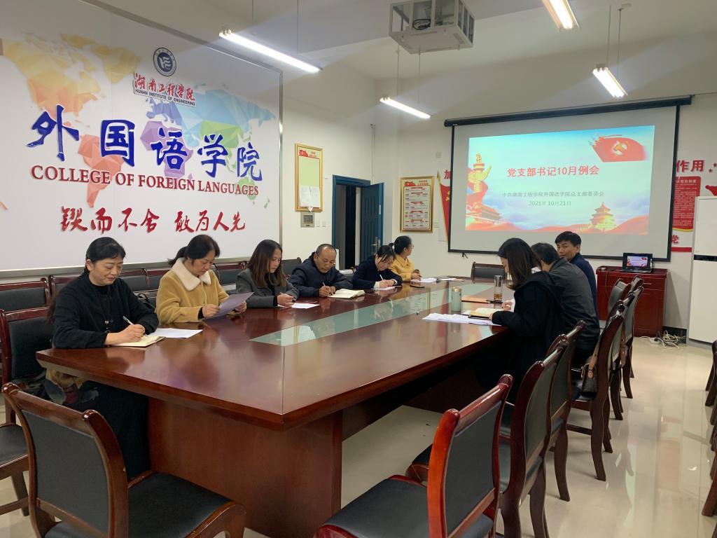 10月21日下午,外国语学院党总支部在F119会议室召开党支部书记例会,会议由党总支部书记陈亚琼主持,党总支部副书记罗望阳,组织员,教工一支部、二支部,学生支部书记参加例会。
