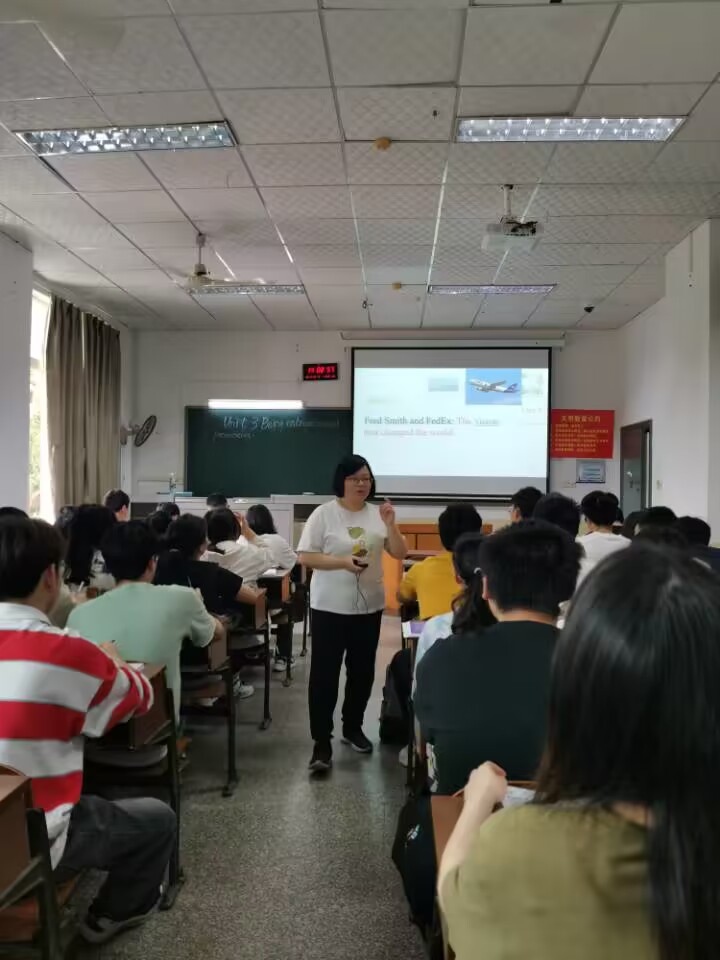 周冬华老师此次公开课的授课对象为2021级经济学专业的学生,授课内容为《新视野大学英语》第四册第三单元“Being entrepreneurial”讲述的是联邦快递的总裁弗雷德•史密斯先生的创业故事。首先周老师通过学生的课堂展示环节(国内快递公司和联邦快递的比较,成功企业家的创业故事等),引出企业和企业家的主题。然后她再从“企业家精神的定义,”“成功的企业家所需具备的个人品质,”“企业家精神带给大学生的启示”几个方面,帮助学生深入领会本单元的主题和语言知识点。周老师精心设计课堂活动,巧妙地将词根词缀的记忆法和“中国精神,工匠精神”思政元素融入到主题的教学中,通过引导学生认识到个人命运与国家命运紧密相连,鼓励学生找到自己未来人生发展方向并为之付出努力。周冬华老师教态自然大方,语言基础扎实;教学内容丰富,课堂互动好,学生积极性高。
