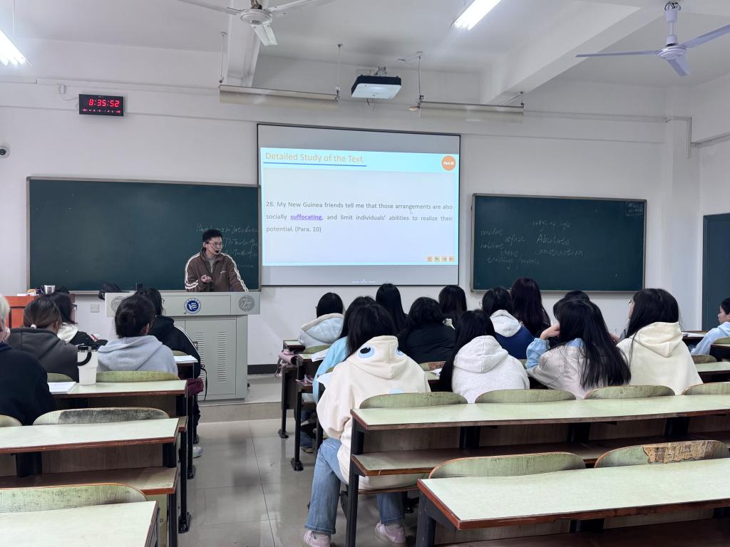 本次公开课的主要内容是Unit 3 What We Lose or Gain in Cities,授课对象为英语2402班。聂老师首先回顾课文结构,然后讲解课文重点句子和章节,包括字词、语言、语法、表达、外延等,通过对比城市生活的优点和劣势,以及乡村生活的利与弊,并对两种不同的生活方式进行比较和队长,以此引导学生辩证思考个体选择与社会发展的关系。授课教师以扎实的语言分析、生动的案例对比和启发式互动,不仅提升了学生的语言能力,更潜移默化地培养了其批判性思维,课堂氛围活跃,教学效果显著。
