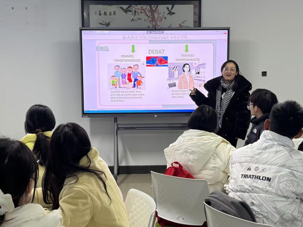 张老师的公开课以《新大学法语3》第6单元:Femme et famille为授课内容,授课对象为商务英语21级学生。该课程曾获“2023年外语课程思政优秀教学案例征集与交流活动”全国优秀教学案例二等奖及湖南省优秀作品特等奖。首先,张老师通过问卷星问卷调查导入,引导学生思考。随后,张老师通过PPT展示快速阅读的问题,学生通过学习通抢答回答问题,再以树形图总结文章主要内容和结构,最后回顾问题总结出课文的三种女性形象,由此导入辩论。其后,张老师引导学生展开辩论环节,以传统女性和现代独立女性为各自优选形象进行两个班级间的辩论。每个班级各自准备素材,并推选出四名辩手参与辩论。辩论结束后,张老师对辩论过程和核心句子进行点评,师生再共同评选出最佳辩手。课程尾声,张老师引导学生进行本课主题升华。张老师从辩论的两种女性形象与两段视频素材引出中国的传统女性和独立女性的各自四个特点词汇,学生以抢答的方式进行填空,总结出中国传统女性的美德,最后得出结论:遵从自己内心,在哪里都能独立,最终辩论双方得到和解。最后,张老师根据学生个体差异,要求学生根据自身需求完成学习通平台上的语法和词汇知识点巩固学习。张老师将思政内容巧妙地融入教学,实现了知识传授与价值引领的有机统一,教学方式方法灵活多样,熟练运用信息化手段运用,课堂氛围活跃,学生参与度高。通过这堂课,学生们不仅在语言技能上得到了锻炼和提升,更在思想道德和文化素养方面收获颇丰。